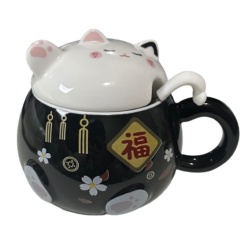 $8.00 15oz Fortune Cat Mug With Lid And Spoon # MGL09-BK |