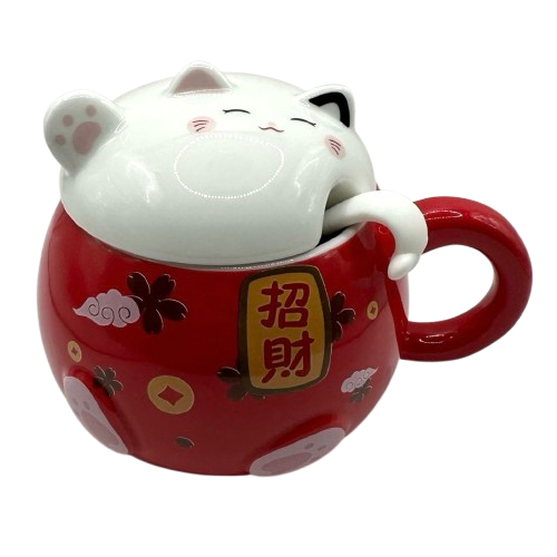 $8.00 15oz Fortune Cat Mug With Lid And Spoon # MGL09-RD |